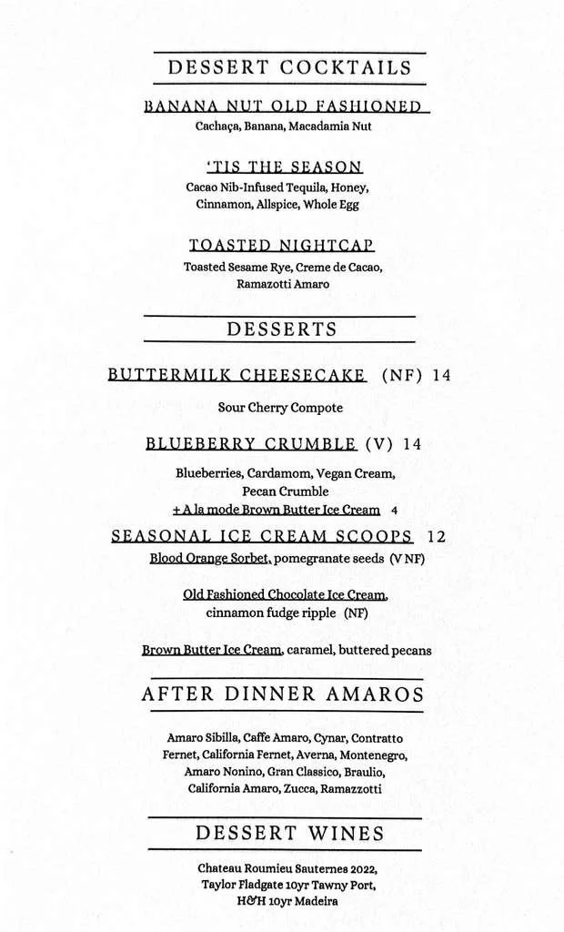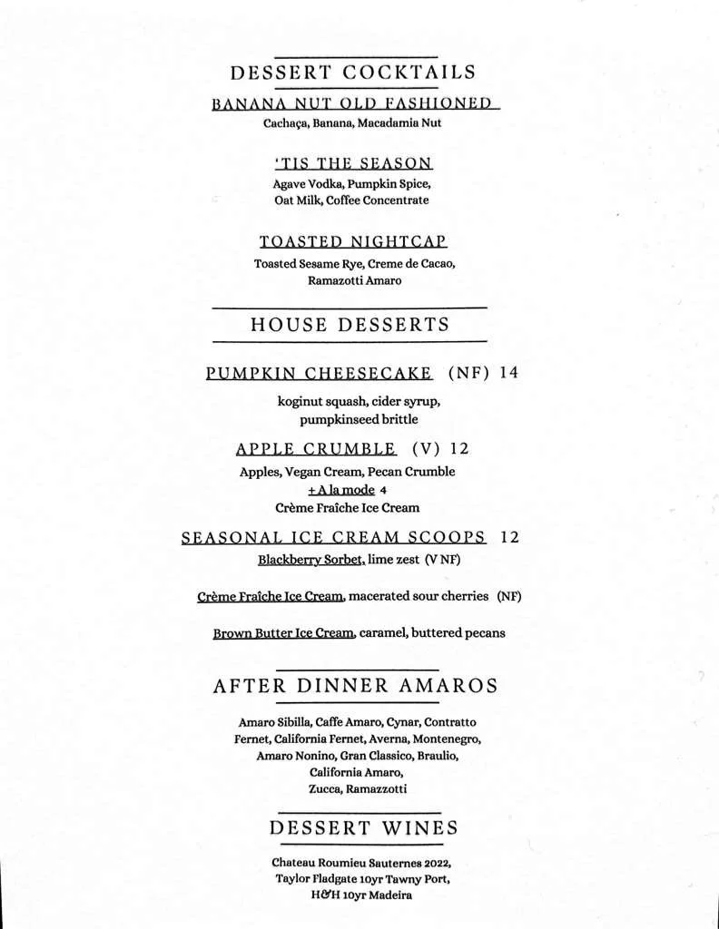 Please note: we change our Dessert Menu often to incorporate seasonal offerings from our local farmers. The most recent menu can most often be found on Conifer’s Instagram account. Thank you!